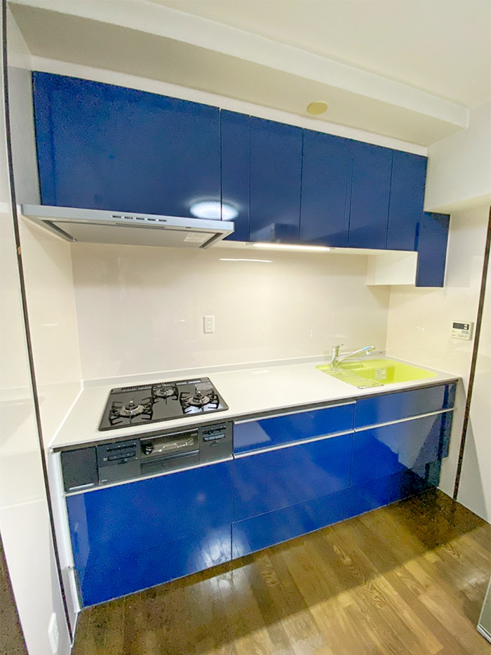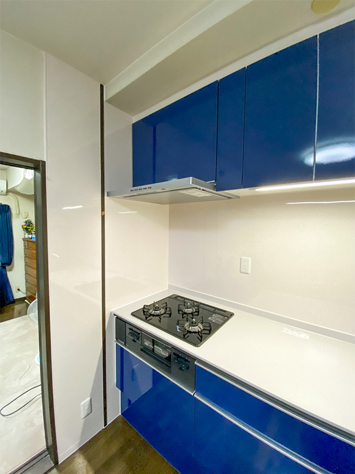 キッチン:LIXIL シエラS 間口2400mm(扉色:クラシックブルー) パネル:ジャパン建材 ブルズキッチンパネル |