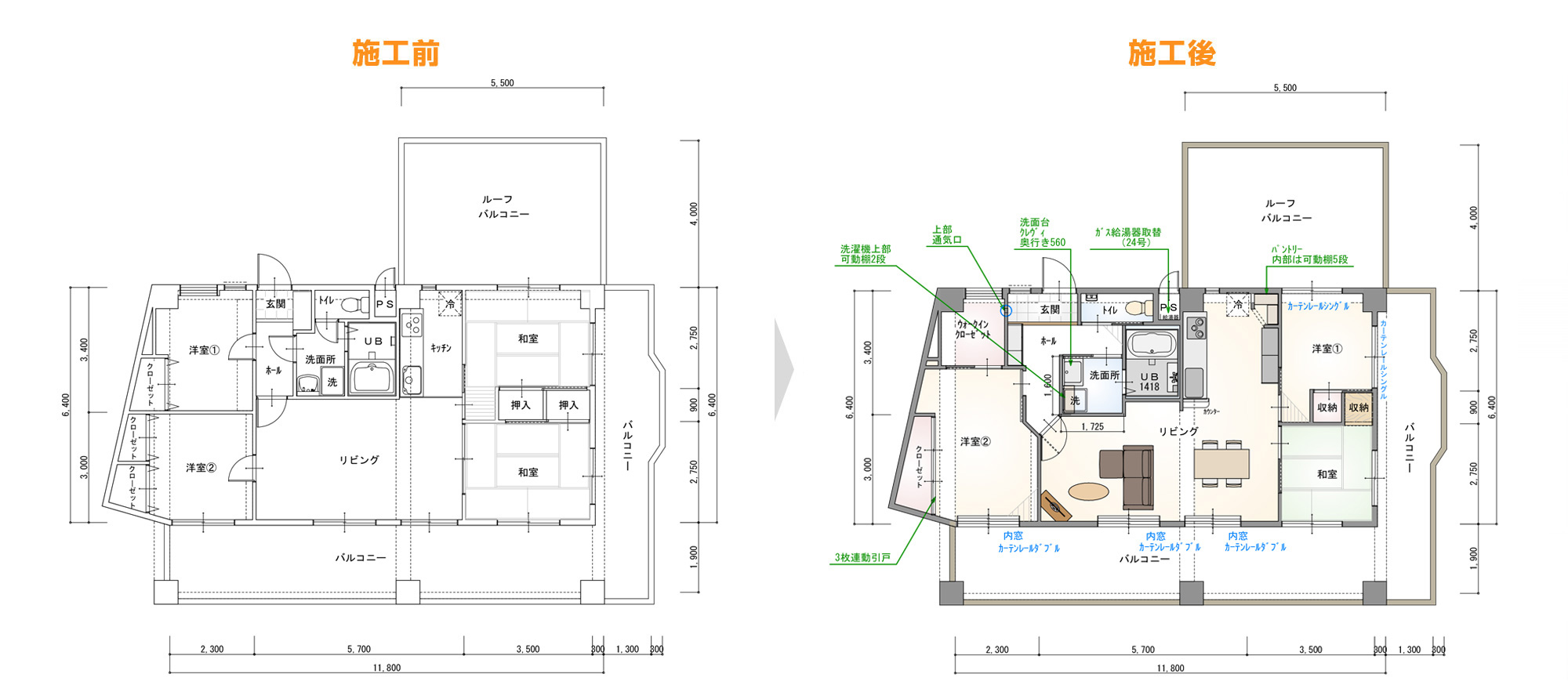 | リフォーム内容 | マンションフルリフォーム、内装リフォーム、キッチンリフォーム、バスルームリフォーム、洗面リフォーム、トイレリフォーム | ||