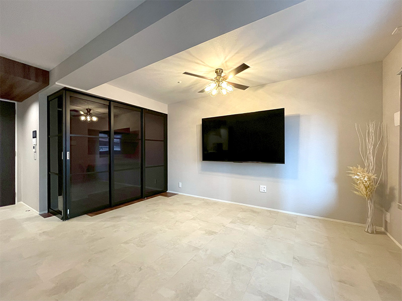 間仕切り建具:タチカワブラインド プレイス デスク:南海プライウッド リビアス90 他:間仕切り壁解体、天井・床・壁補修、クロス張替、壁掛けテレビ用補強工事、電気工事 ※床材はお施主様がご用意・施工されました。 |