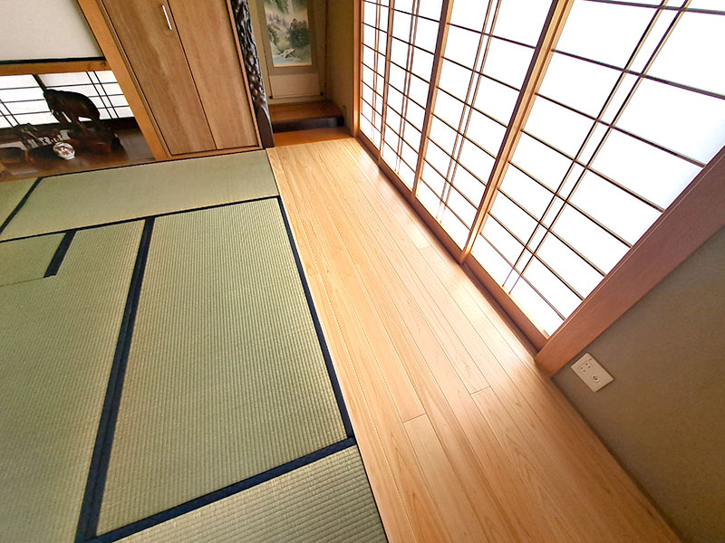 よくある畳をフローリングにする工事とは異なり、和室の雰囲気を生かしたリフォームとなるため、使用した材木は縁甲板です。